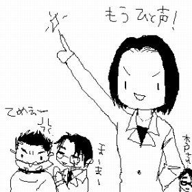 彩「拍手、ありがとな〜。アンタ、ええことあるで?」 近藤「木戸さん、そういう無責任な発言は控えた方が・・・」 彩「何?近藤さん。アタシになんか文句あるの!?」 近藤「いえ・・・めっそうもないです」 金太郎「ねーさん!!捕まえて来ました!!」 彩「お、金太郎。たまにはやるやないの!」 金太郎「たまにはって・・・姐さん・・・」 近藤「遠山君、その大きな袋には何が?」 彩「これか?これはな〜、お客さんの『幸せの元』や」 近藤「幸せ・・・?」 彩「さぁ、寄った寄った!!拍手ボタン押してくれた人にだけ、特別サービスやで!!」 近藤「・・・?」 彩「『真山徹を一時間自由に出来る券』、一枚8万円からのスタートや!!」 袋詰め真山「おい、木戸!てめぇ!!」 近藤「じ、人身売買・・・!?」